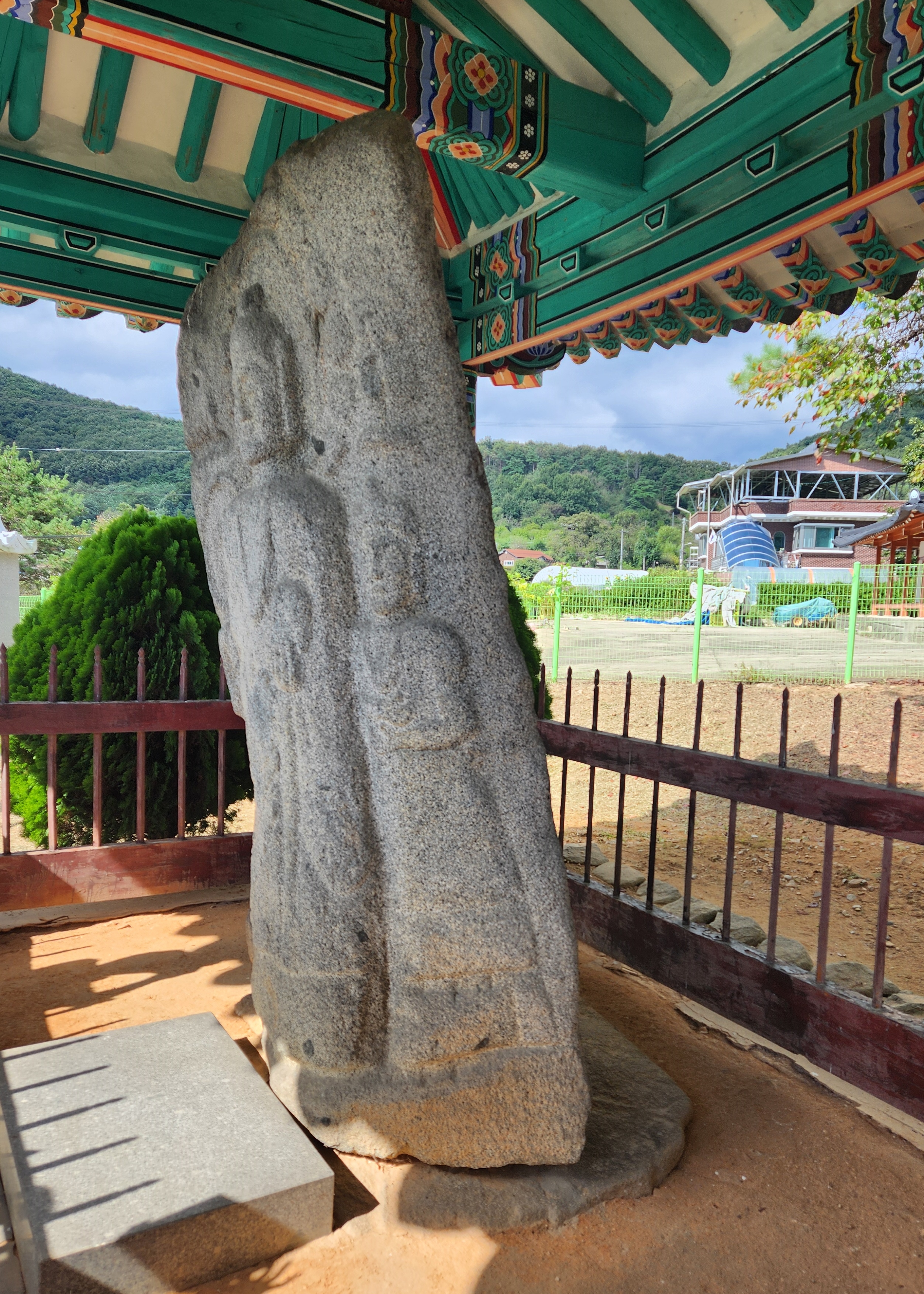 옛 석은사지에 세워진 통일신라시대의 석불입상으로 현재 기와지붕만을 씌운 누각 안에 서 있다. 직사각형의 네모나고 평평한 돌에 새겨진 이 불상은 중앙의 본존불을 중심으로 좌우에 보살입상이 배치된 삼존불(三尊佛) 형식을 이루고 있다.