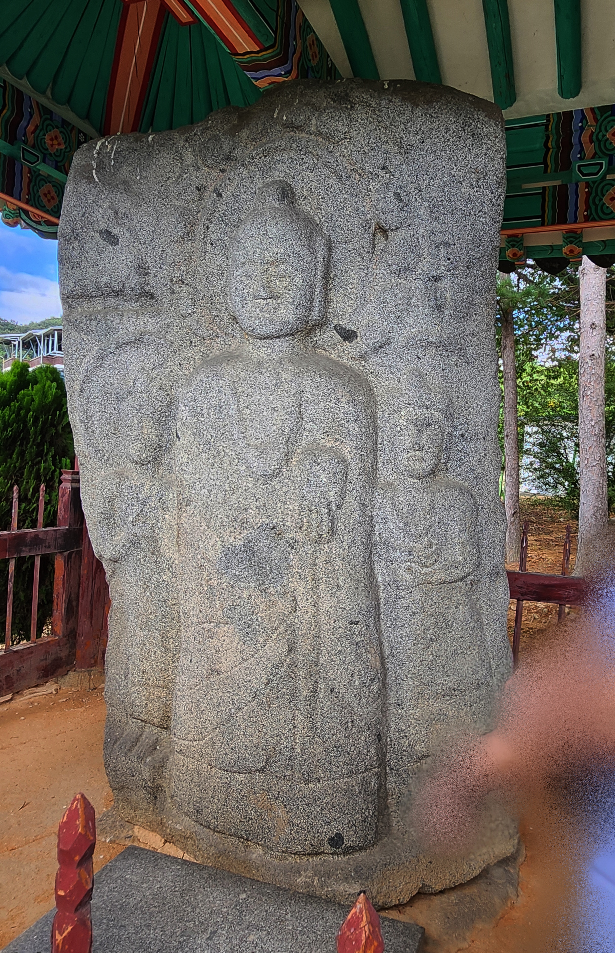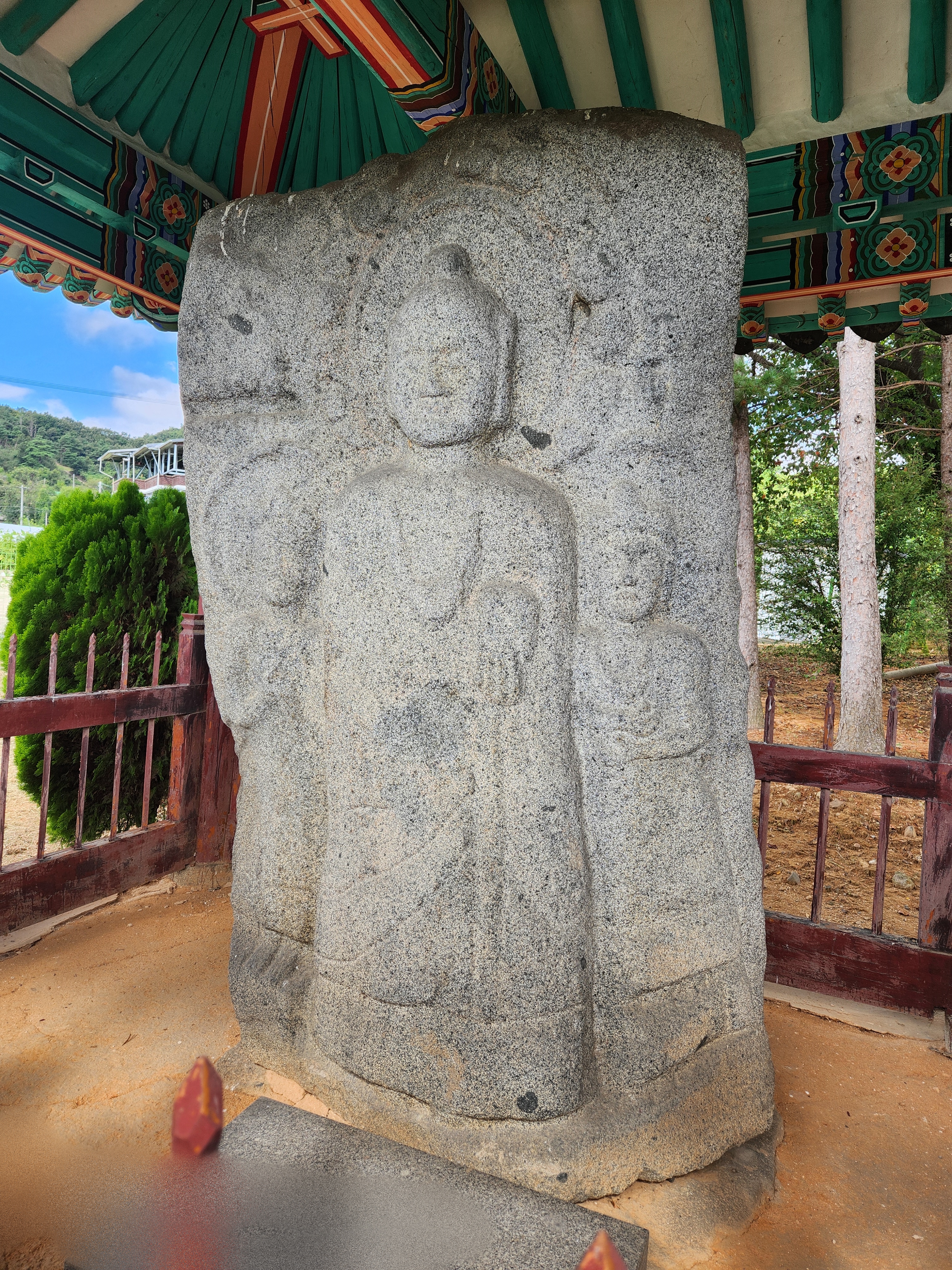 1989년 보물로 지정되었다. 본존 높이 2m, 보살상 높이 1.36m. 사각형의 큰 바위를 광배로 하여 삼존불을 부조로 새긴 이 불상은 고식(古式)을 띠고 있어 주목된다.