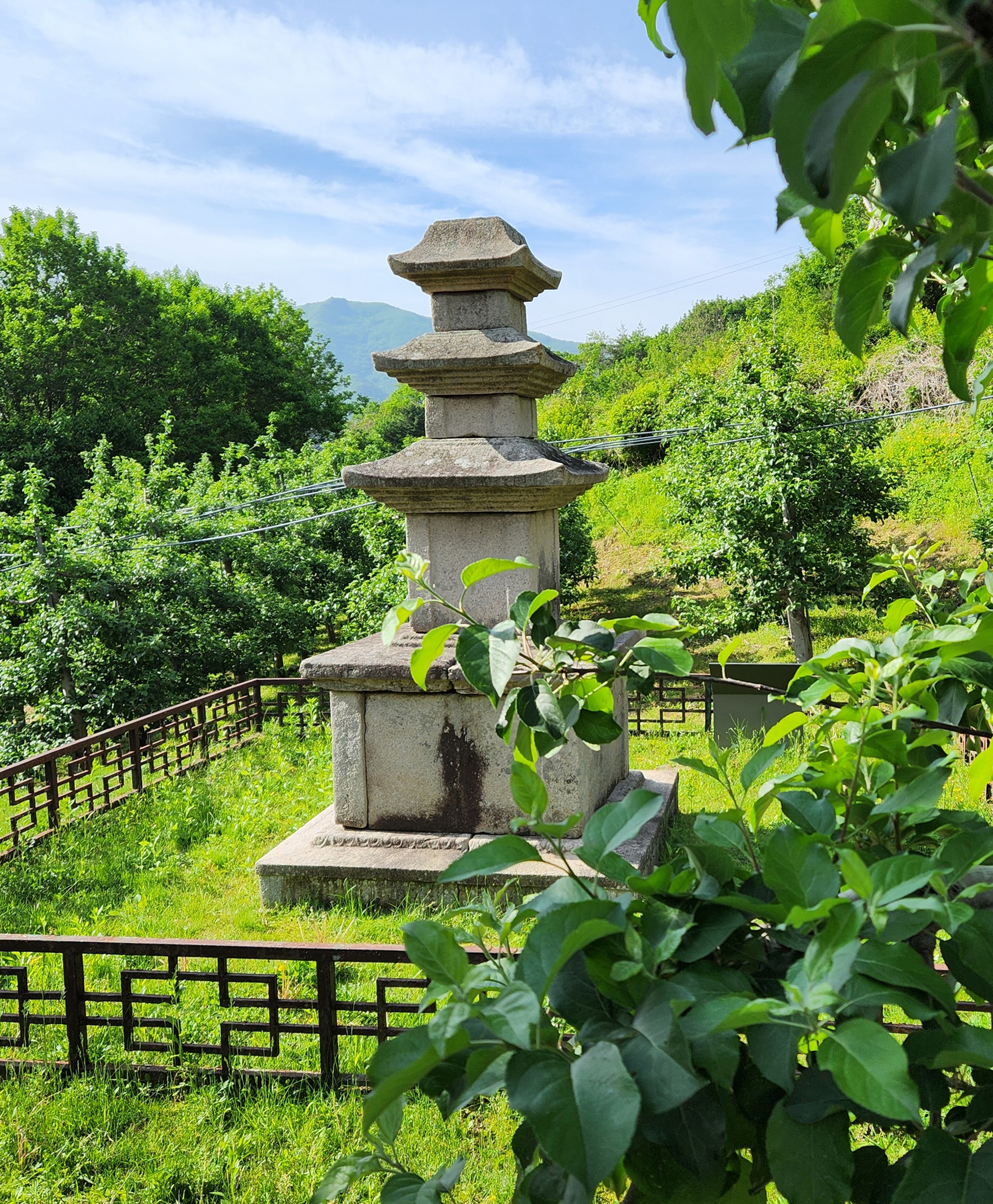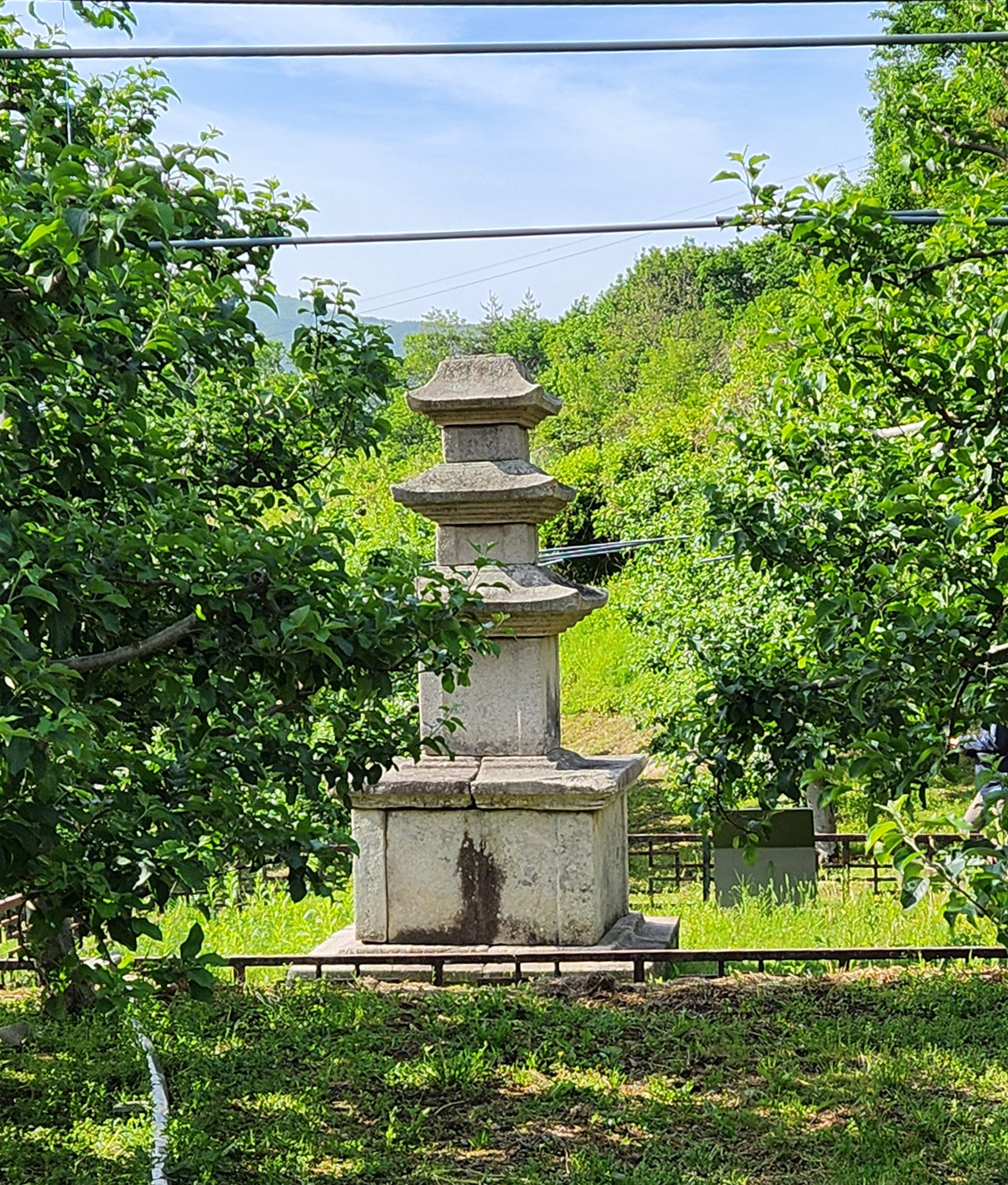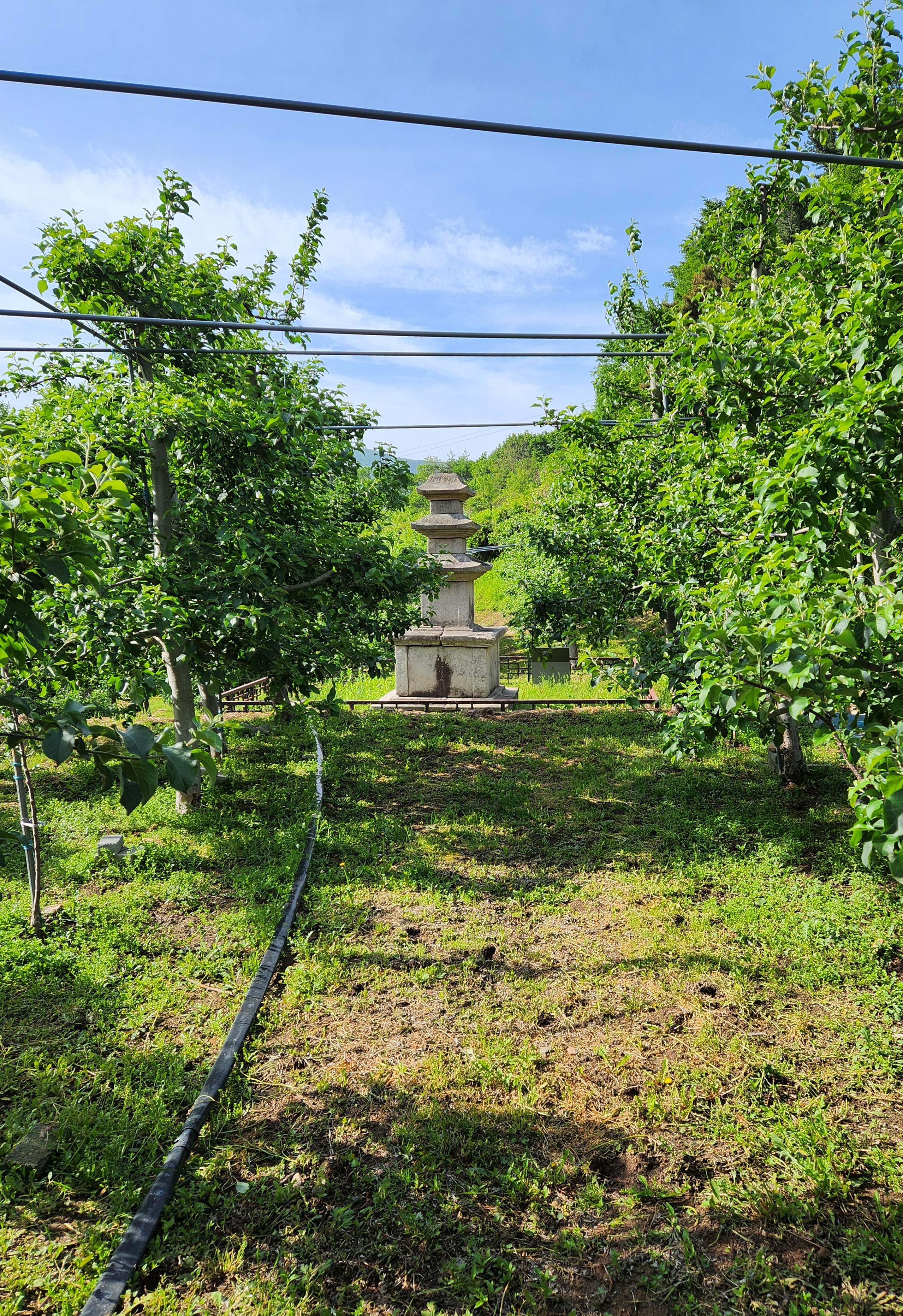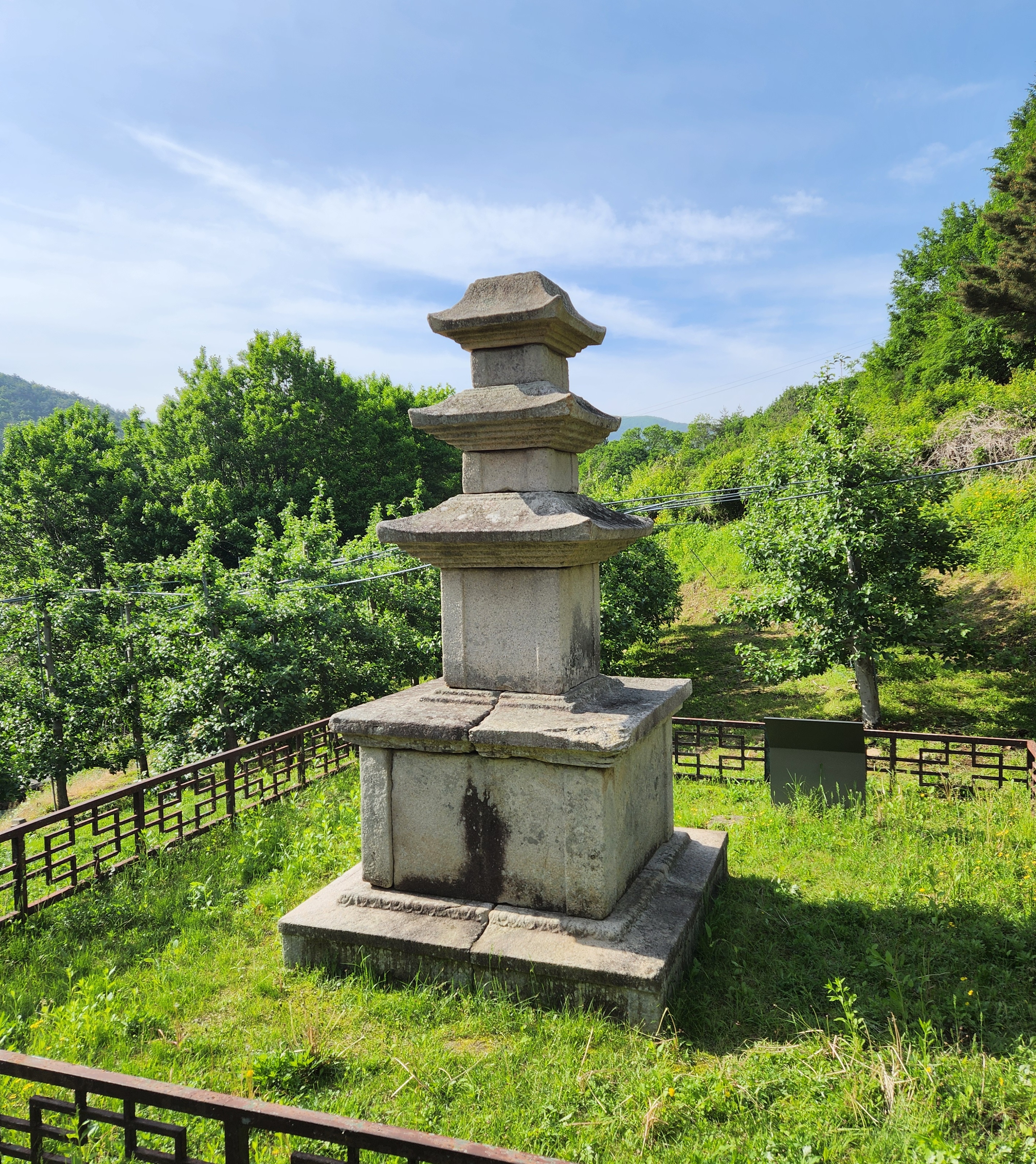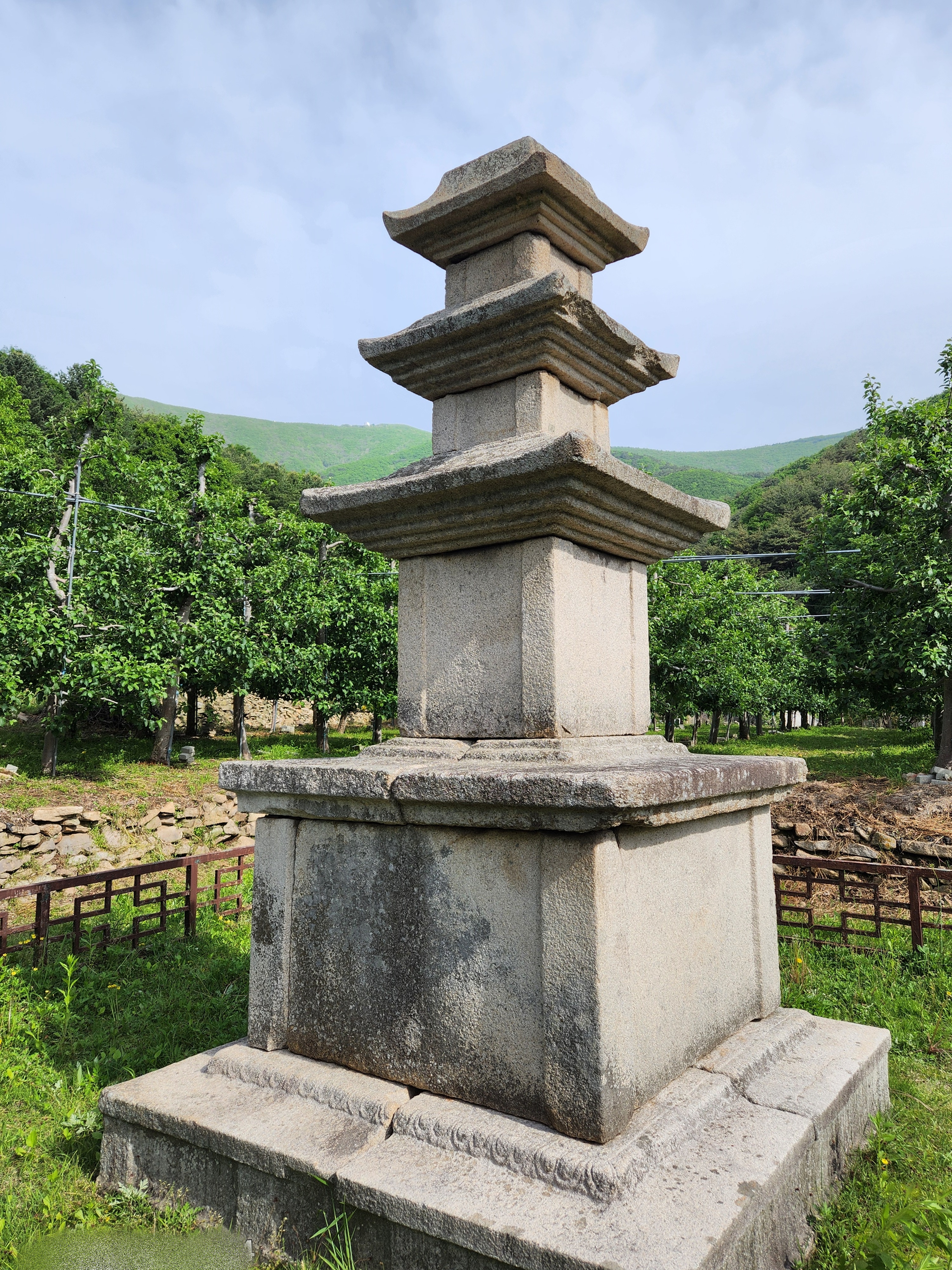 현재는 밭으로 사용되는 자그마한 터에 서 있는 탑으로, 2층 기단(基壇) 위에 3층의 탑신(塔身)을 올린 모습이다.